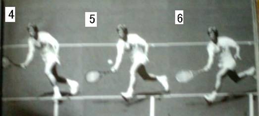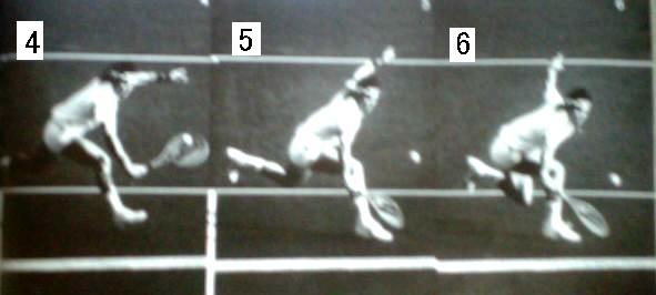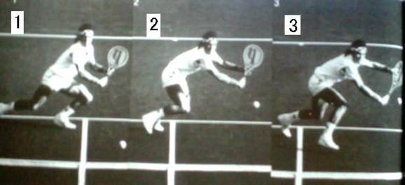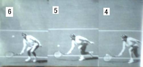 これもキャッシュ選手のバックボレー。 1は横を向いただけで、ラケットの位置は体の前。引く様子はない。 やや遠いボールのためほぼ真横に移動して