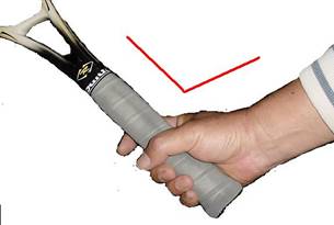 この持ち方は一見、力を入れ握っているように見えるかも知れないが、実際手の平は触っている程度の力加減。 硬式テニスをするなら必須の持ち方である